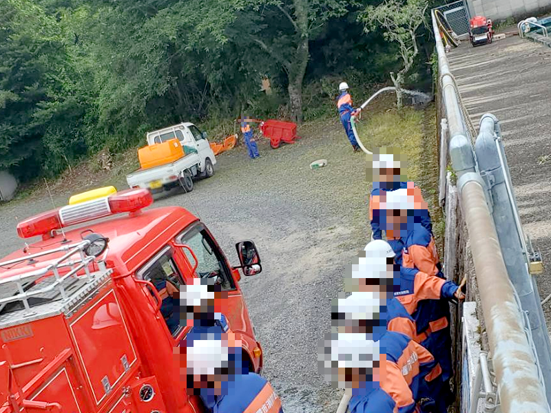 > 神野地区 消防団放水訓練(神野小プール) 消防車両点検