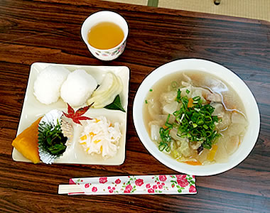 この日の昼食はでんぷん汁・かぼちゃの煮つけ・なます・はやとうりの漬物・おにぎりでした。
