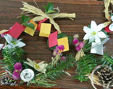 もうすぐクリスマスとお正月がやってきます。そこで午後からはどっちの行事にも使えるリースを作りました。みんな指先を一生懸命に動かして、ステキなリースを作り上げましたよ。