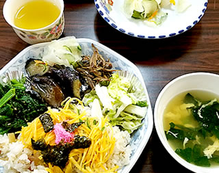 | 昼食 | ちらし寿し、ほうれん草のごま和え、はくさいのごま和え、ナスビの素揚げ、とき玉子(ほうれん草) |