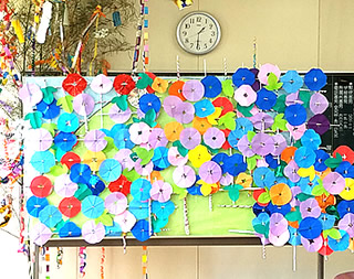 お昼からは「朝顔を咲かせよう」ということで、チラシを丸め格子を作って、スタッフが作っていた花をみんなで貼り付けたりと、細かい作業がありながらも、みなさん役割分担をしながら、黒板より大きな製作物が完成しました。きれいに咲いた朝顔で部屋中が明るくなりました。