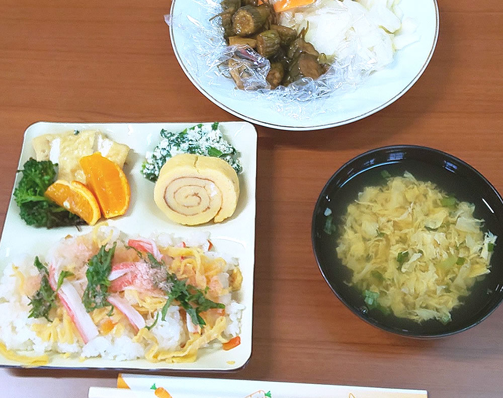 この日のお昼ごはんはもちろん「ちらし寿司」です!!かきたま汁やだて巻き、お漬物も美味しかったです♪♪
