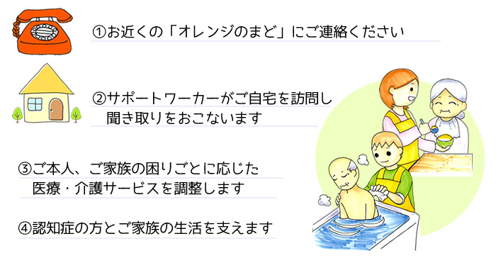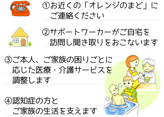 鹿屋市では認知症になっても本人の意思が尊重され、できる限り住み慣れた地域で暮らし続けられるように、鹿屋市民に対する啓発活動をはじめ、認知症の方やその家族からの相談 ・早期支援を行うために『鹿屋市地域包括ケア推進サポートワーカー』を養成しています。そのサポートワーカーが所属している会社が「オレンジの窓」です。